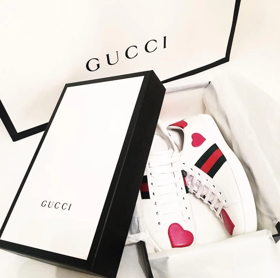 New shoes alert.. I've never been one for designer trainers, but I decided to treat myself after seeing a few of my style icons such as Kourtney Kardashian, Kylie Jenner, Milena Les Secret and lots more sporting these cute Gucci trainers..These trainers come in so many different designs; swarovski crystal lips, embellished pineapples, embroidered flowers and many more. I decided to go for the love heart design as they weren't just as detailed as the other pairs and would go with most things in my wardrobe. I can't wait to style them in summer with cute dresses and denim shorts!