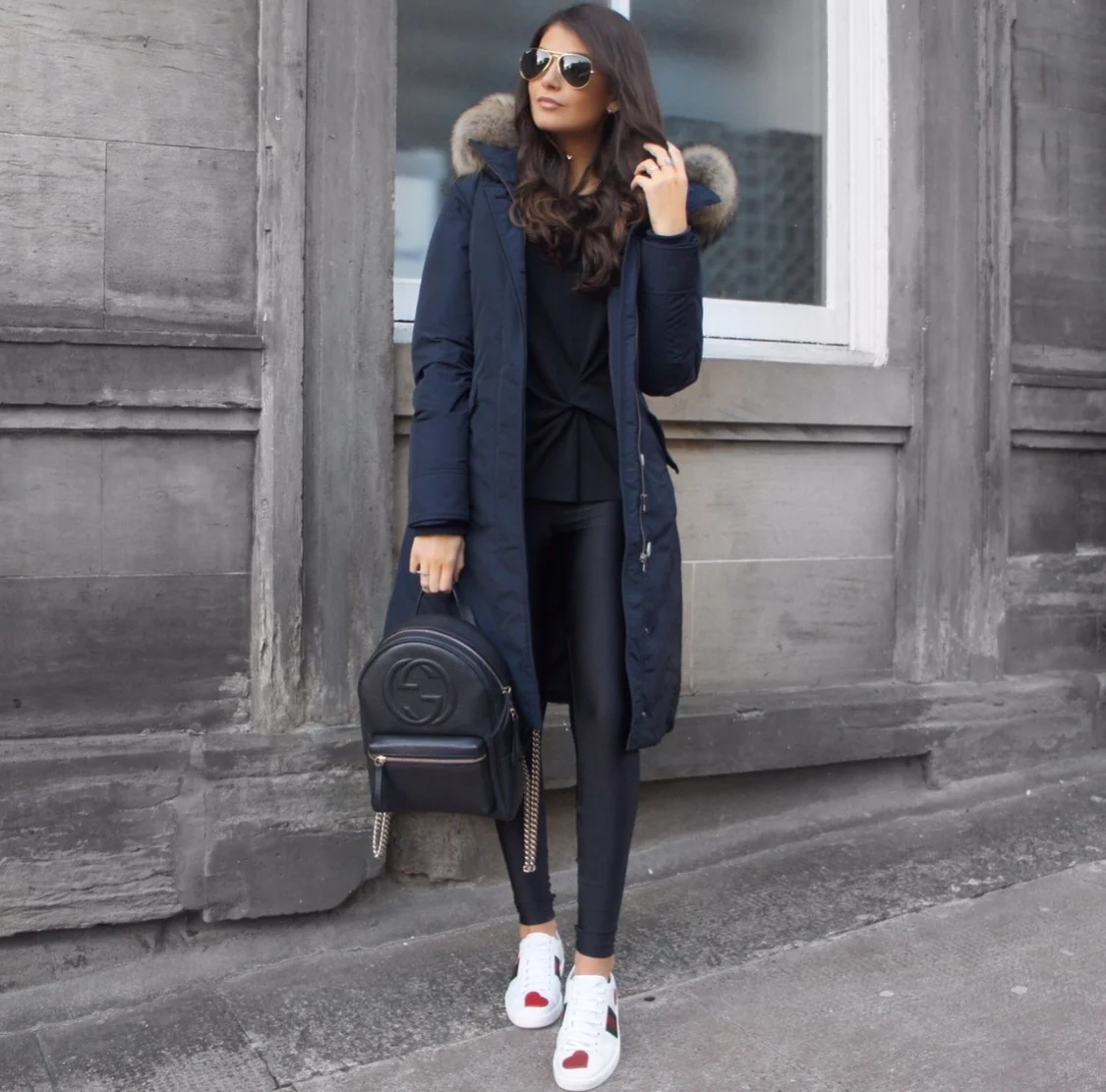 I finished this look off with my cute little backpack and my favourite black basics which are great and comfortable under a big coat! Shiny leggings are super comfy but also look a bit more stylish than your average black leggings.